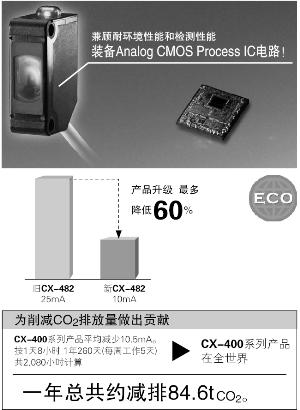 CX-400系列裝備新開發的定制IC電路,在提高環境適應性、檢測性能和可靠性方面做了種種改進,產 品陣容共計140種。產品升級,各機型平均降低功耗44%,最多者降耗達60%。為節能、減排CO2和保 護地球環境做出貢獻。