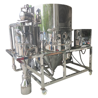 空氣通過過濾器和加熱器,進入干燥室頂部的熱風分配器,熱空氣呈螺旋狀均勻地進入干燥室。料液經過過濾器,由泵送到在干燥室頂部的離心噴霧頭,被噴成極小的霧狀液滴,以極大的表面積與熱空氣接觸,水份迅速蒸發,在極短的時間內干燥成顆粒制品,在塔底和旋風分離器中捕集濕廢氣由風機排至室外。